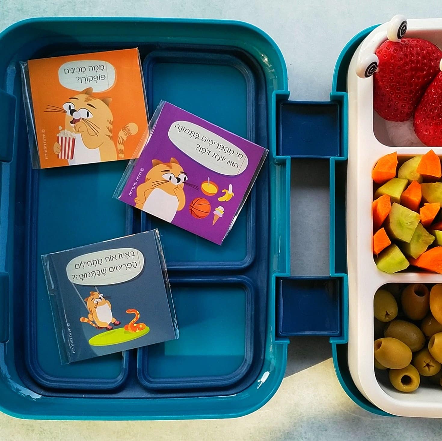 כל קופסה מכילה 50 כרטיסים באריזה צבעונית ומהודרת שכיף לקבל. כל כרטיס מגיע כיחידה עטוף בניילון ששומר עליו ממגע עם האוכל. בכל קופסה חידות במגוון נושאים: חיות, צבעים, מספרים ואותיות ועוד. המארז תומך בתכנים של הכנה לכיתה א’. הנושאים ורמת השאלות מותאמת לילדים בגילאי גן טרום-חובה וחובה. נדרש סיוע של מבוגר לקריאת השאלה: ניתן להקריא לילד בבוקר או לבקש את שיתוף הפעולה של הגננת או הסייעת בגן.